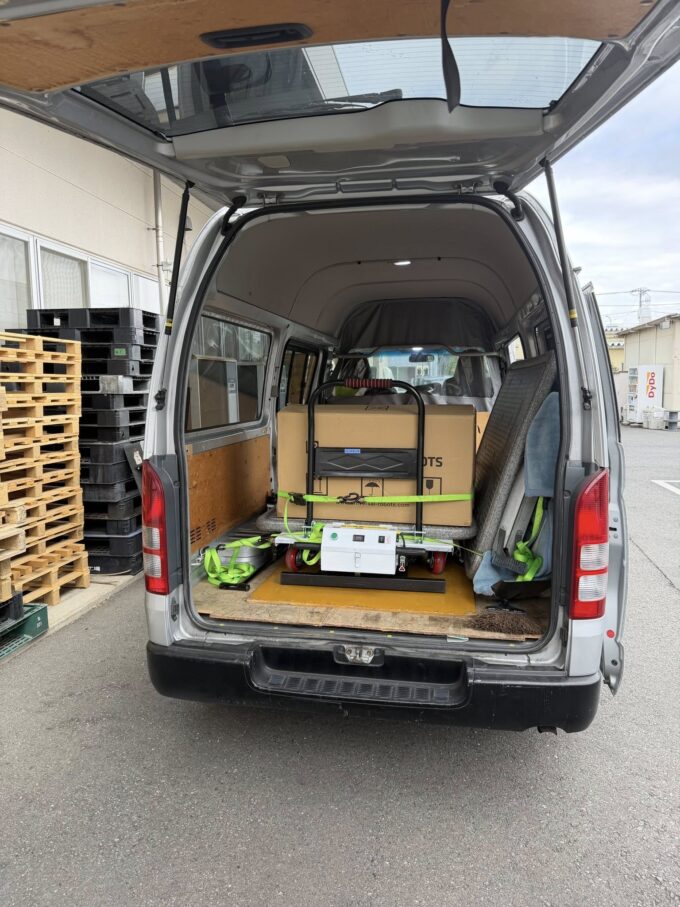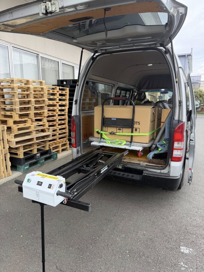 今回から、弊社で販売予定の専用台車を使用し、荷台ごと上げ下ろしを行っています。